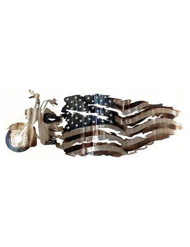 Rev your engine for this Harley motorcycle with tattered flag metal wall art design.