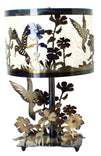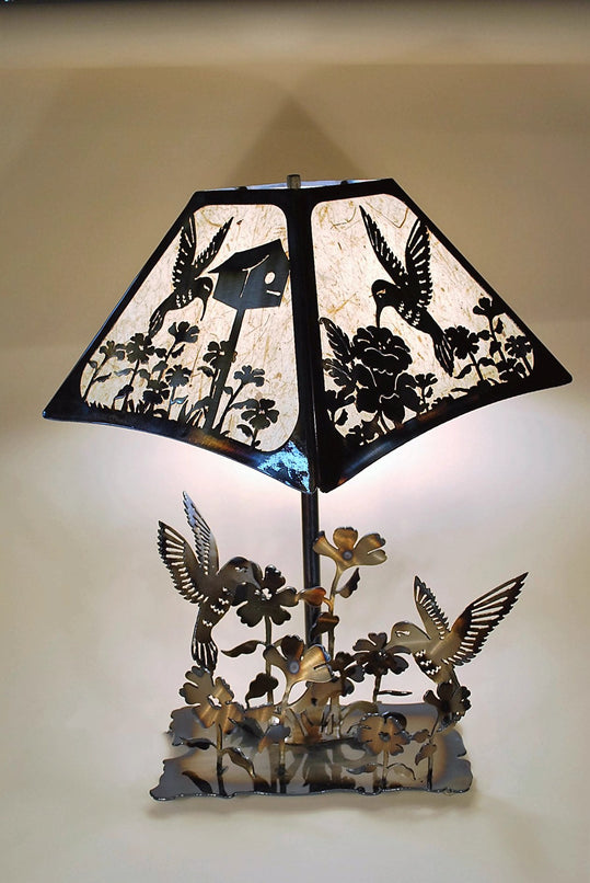 A Hummingbird large metal art base with a round shade. The durable shade material creates a soft filtered light that highlights all of the details. Use the 3 way socket to control light for reading or atmosphere. Made of our thicker 12g steel, it makes a striking piece for the Hummingbird lover, or anyone looking for a pretty, natural and unique lamp. Like all of our work, it is powder coated as a final step to prevent rusting or tarnishing. Hand made by American craftsman.