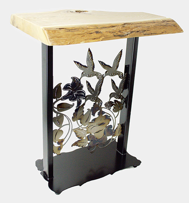 This table is a black powder coated steel base with a natural edge Walnut top and a polyurethane finish. The scene is held on with strong magnets making it interchangeable so you can easily customize the table and change the scene to fit a changed environment or mood.   The current designs are shown but we can fit any of our existing wall art designs.    Additional images are available for $89 each.
