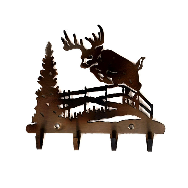 A deer jumps a fence in the countryside bordering wilderness in this wildlife design atop a 4-hook key rack.