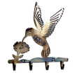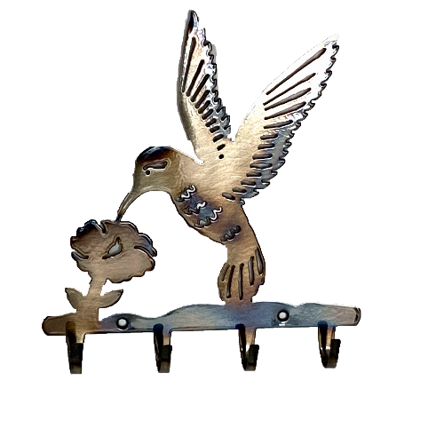 A busy hummingbird visits an alluring flower atop this metal art design on a 4-hook key rack.