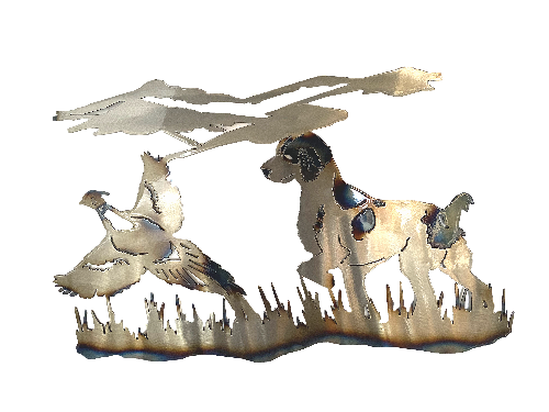 The Brittany in field flushing a pheasant. This metal wall art image of a Brittany dog is showing the Brittany as the hunting dog it was bred to be. Of course, they are great companions too!
