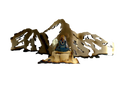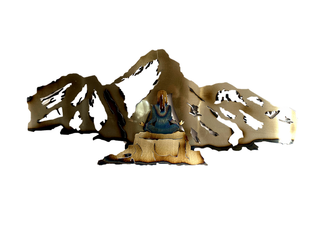 Tranquility is the message for this calming vista. The meditating figure is a separate piece that when attached to the mountain background, provides depth. A calming image to hang in a special place.