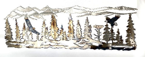 Eagle Mountain metal wall art in a size that works above doorways and any space where you need a wide but short piece.