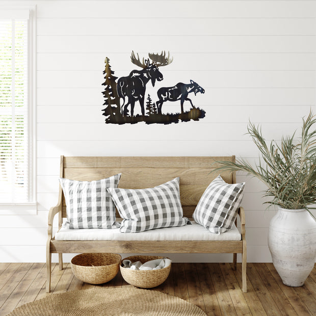 The noble moose stands tall amidst pine trees in this wildlife metal wall art design.