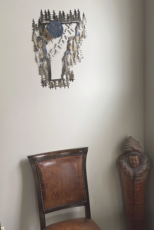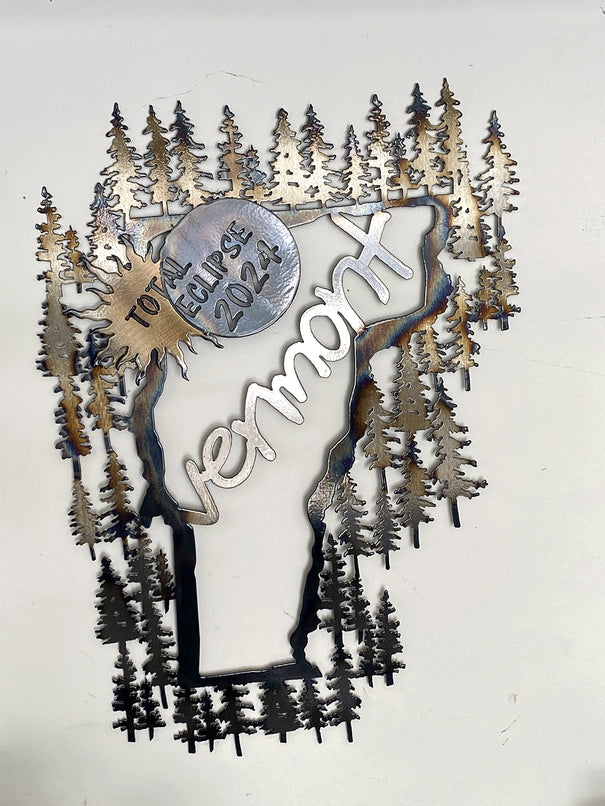 A unique wall art to commemorate a once in a lifetime natural event, a total eclipse that passed over Vermont. Made of 18 gauge steel, it is flame colored and powder coated creating the classic Metalcraft Design natural look. The sun and moon is a separate piece attached with magnets. This creates depth and allows you to place it anywhere on the Vermont background. A unique memento fitting the cosmic wonder of the day.