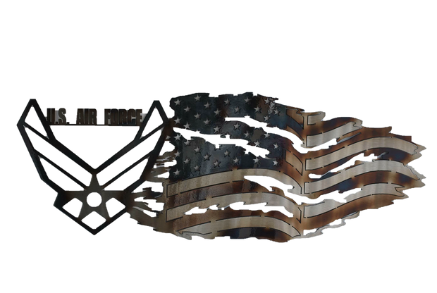 Part of our military collection of unique metal wall art, this symbol of the USAF combined with a tattered American flag looks great anywhere you hang it.