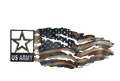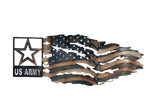 Part of our military collection of unique metal wall art, this symbol of the US Army combined with a tattered American flag looks great anywhere you hang it.