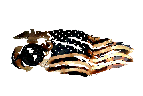 Part of our military collection of unique metal wall art, this symbol of the US Marines combined with a tattered American flag looks great anywhere you hang it. A great gift for your active duty or veteran Marine.