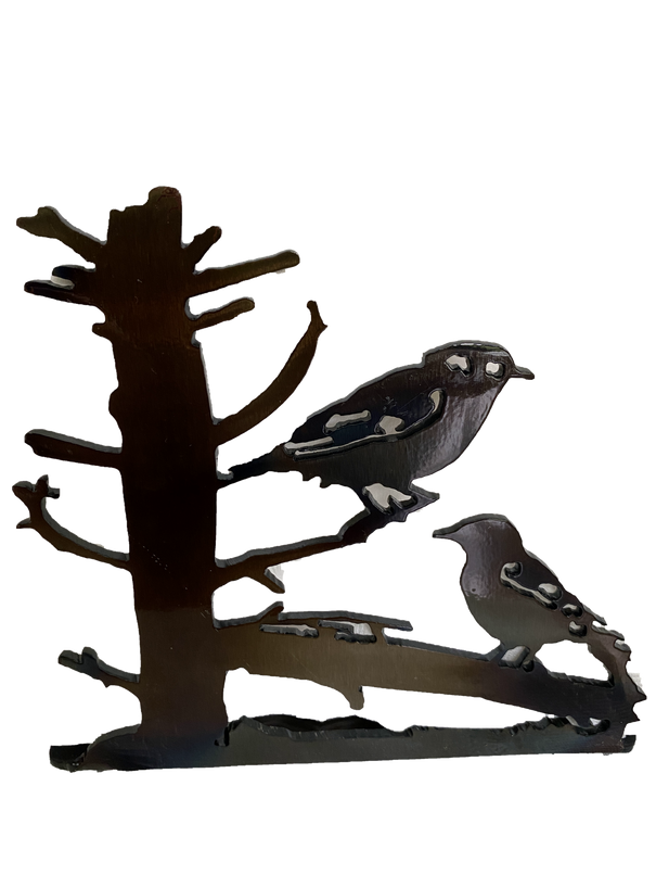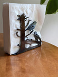 Blue birds sing from the branches of a tree in this design for a metal large napkin holder.