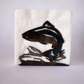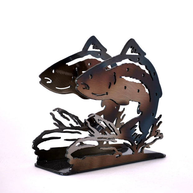 A steelhead trout breaks the surface of the lake challenging all those who would try to take him home as a prize in this fishing-themed design for a large napkin holder.