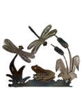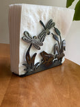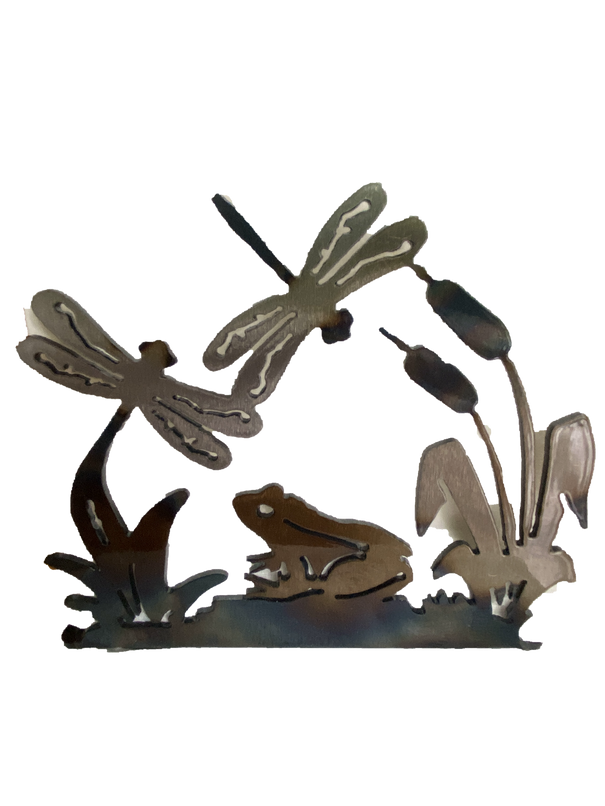 A frog sits perched between two dragonflies in a metal art design that's practically a painting on the sides of this large napkin holder.