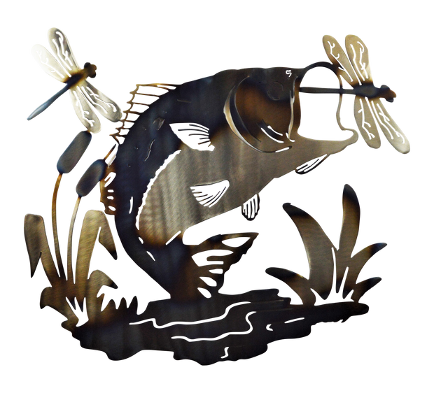 This Bass and Dragonflies art is one-of-a-kind. Made with 18-gauge steel it has the weight and rigidity of quality but is still light enough to hang easily.