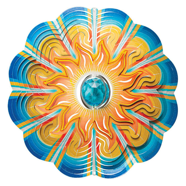 The Sun Crystal Wind Spinner features a colored crystal center. All of our new wind spinners reflect light from the surroundings, but the crystal centered designs create a stunning optical illusion. . The Sun Crystal Wind Spinner has a large surface area to reflect off, thus catching all the light. Watch as the light flickers through all the layers resulting in an amazing ripple effect across the spinner, then hits the crystal in the center causing prisms of light to scatter around. Hang this Wind Spinner in your garden where it will spin naturally in the wind, or if in a calm area, use one of our solar powered motors, or a battery motor indoors.