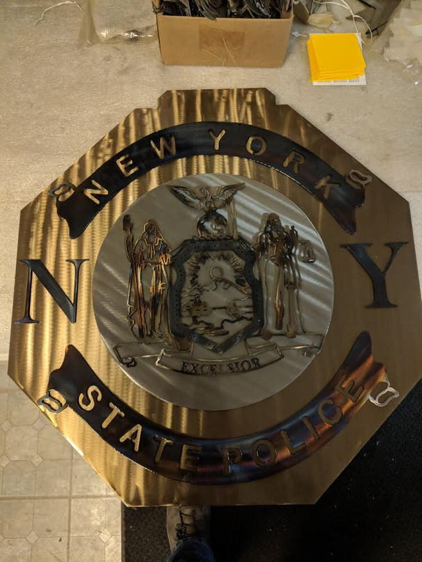 This badge is multiple layers and was made as a retirement gift for an officer in the New York State Police.