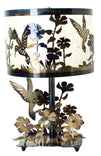 A Hummingbird small metal art base with a round shade. The durable shade material creates a soft filtered light that highlights all of the details. Use the 3 way socket to control light for reading or atmosphere. Made of our thicker 12g steel, it makes a striking piece for the Hummingbird lover, or anyone looking for a pretty, natural and unique lamp. Like all of our work, it is powder coated as a final step to prevent rusting or tarnishing. Hand made by American craftsman.