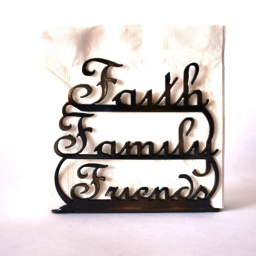 Express your values with a heartfelt homage to faith, family, and friends in this metal art design for a large napkin holder.