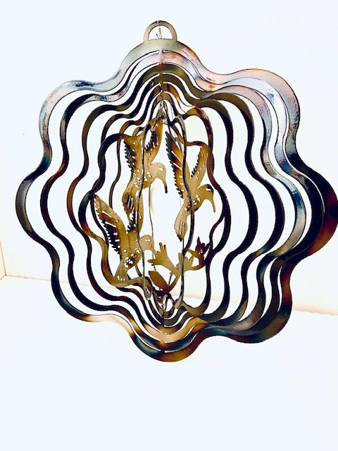 Brighten up your garden or porch with a beautifully hand crafted metal wind spinner. These unique pieces are a 3D design that catches wind and the light from all angles. When the sun hits them they sparkle!