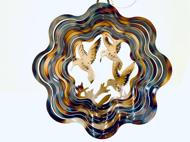 Busy Hummingbirds visit an alluring flower in this pretty garden scene. Hummingbirds are fascinating and a most unusual bird. They look almost real in this spinner as they twirl in the wind.