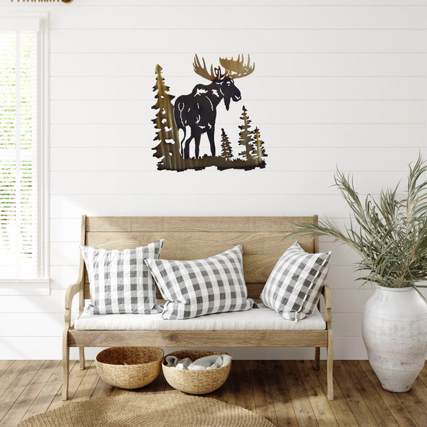 The noble Moose stands tall amidst pine trees in this wildlife unique metal wall art design. The Moose has large antlers and a distinctive profile. It is a special wall art that will decorate any rustic place.